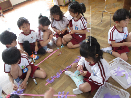 みんなで藤の花をつくると「葉っぱがいるね!」と声が上がり何でつくればいいかをみん...