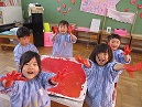 絵具でぬたくり遊びをしました。 手で絵具を塗り広げ、「きもちい〜!」「見て!手が...