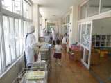 2階保育室での給食の準備の様子です。 廊下で配膳し、おかわりは子どもたちが自分で...