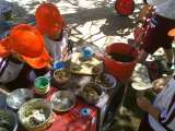 お皿に砂や木の実を入れて、いろいろなご馳走をつくっています! 「いらっしゃいませ...