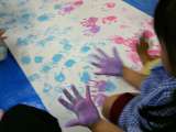 絵の具遊びをしました。 初めは、ピンク、水色、紫それぞれの色を楽しみながら手をぺ...