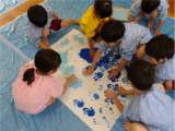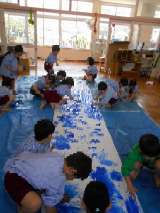 つき組の部屋の端から端まである長い真っ白な紙をプールに見立てて、みんなで水をたく...