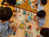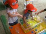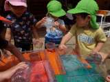 園庭では、水の冷たさや色の美しさなど、五感に触れながら、夏の遊びを楽しんでいま...
