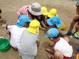 園庭に水を流して、手のひらで混ぜるととろとろの泥に! 「気持ちいい〜!」「クリー...