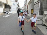 まつ組さんとさくら組さんで一緒に手をつなぎ、海老江西公園までお散歩に行きました。