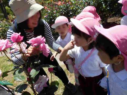 「わぁ!きれいなバラ!!いい匂いがするよ。」「いろいろな色のバラがあるね。」と、子どもたちは、バラの匂いをかいだり、いろいろな色のバラを見て、目を輝かせていました。