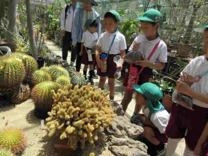 温室では、食虫植物のウツボカヅラを見たり、様々な形のサボテンを見たり、南国の花を見て楽しみました。