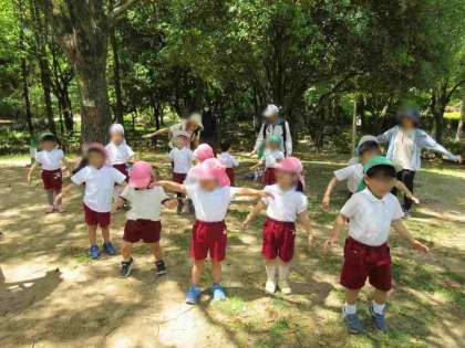 青空の下、友達と一緒に散策したり、体操したり元気に遊びました。