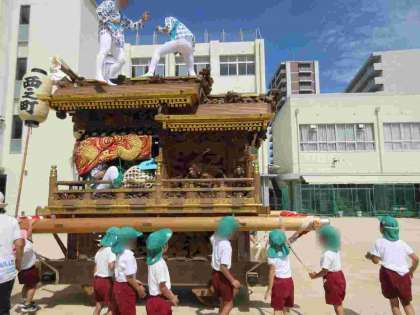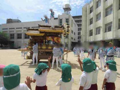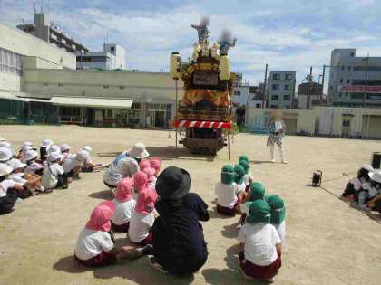 夏祭りふれあいタイム 公開日 2024/07/23 更新日 2024/07/23 園行事 7月17日、18日は地域のお祭りがありました。 幼稚園にお祭りの山車が来てくれて、近くで見せてもらったり、お囃子を聴いたりしました。 お囃子に合わせて踊りだす子もいました♪ 「あんな高いとこにのぼってる!すごいね!!」「逆立ちしてる〜!かっこいい!!」「だんじりめっちゃおっきいな!!」と、みんな大喜びでした^-^ いいね(0)
