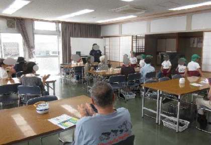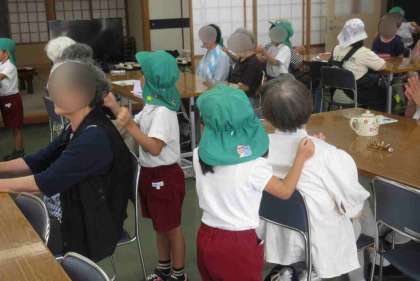 最初はちょっぴり緊張していましたが、地域のおじいさん、おばあさんと一緒に「とんぼのめがね」の歌をうたったり、「かたたたき」のふれあい遊びをしたりしました。