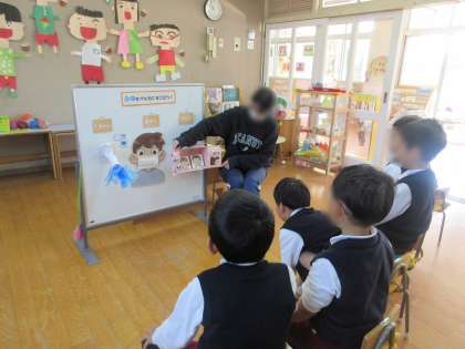 日頃から子どもたちが継続している石けんでの「手洗い」や「うがい」についてや、咳がでているときは、「せきエチケット」をすること、寒いからと部屋を閉めきらずに「換気」をして空気を入れ替えることで、快適に過ごすことができることを伝えました。