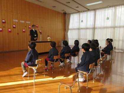 始業式では園長先生に『おせち』のお話を読んでもらい、興味津々で聞いていました。