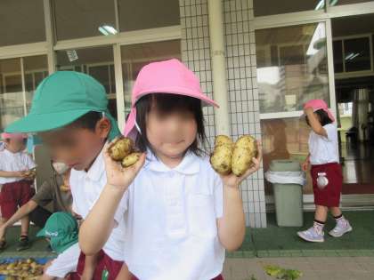 「うんとこしょ!どっこいしょ!!」と、ジャガイモの茎を引っ張ると、さまざまな大きさのジャガイモがついていたり、土の中を探してみるとが大きなジャガイモがいっぱい掘れたりと子どもたちは大喜びでした。