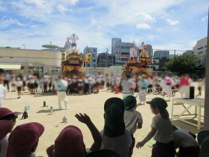 登園時、園庭にだんじりが来ているのを見て、「先生!お祭り来てるよ!!」「早くいきたいな〜!」と、みんな大興奮!!