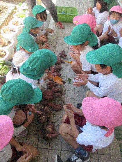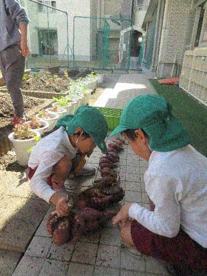 幼稚園のサツマイモを掘りました 公開日 2022/10/24 更新日 2022/10/24 子どもの様子 幼稚園の畑で育てていたサツマイモを掘りました。 出てくるサツマイモの形が様々で、「マイクみたい!」「カボチャみたいなおいもが出ててきた!」と形から連想されるものを口々に話しながら芋ほりを楽しみました。 掘ったサツマイモは、「こっちのほうが大きいんじゃない?」「おんなじ大きさや!」と話しながら大きさ順に並べ、全員で数えました。 19個のいろいろな形、大きさのサツマイモがでてきました。 いいね(0)