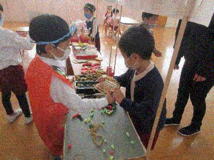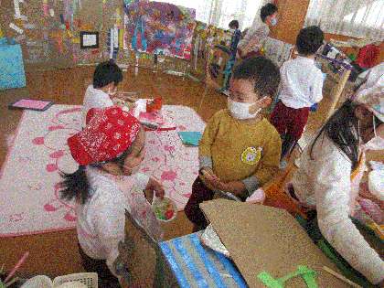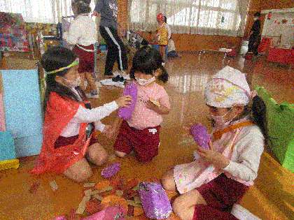 たんぽぽの子どもたちと一緒に遊びました。 公開日 2022/10/26 更新日 2022/10/26 子どもの様子 4歳児・5歳児合同で遊んでいた、お祭りごっことおうちごっこにたんぽぽ(未就園児)の子どもたちが来てくれて、一緒に遊びました。。 自分たちよりも小さなお友達に優しく遊び方を知らせたり、一緒にお祭りで買ったごちそうを食べたり、お家の中でご飯をつくったりしながら遊ぶことを楽しんでいました。 いいね(0)