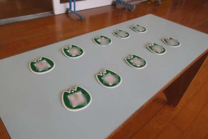 ピカピカの緑色の名札を付けてうれしそうな、まつ組の子どもたち。