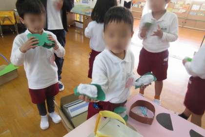 こどもの日の集いをしました(その2) 公開日 2023/05/10 更新日 2023/05/10 園行事 こどもの日の集いを終え、さくら組では柏餅をつくり、「おいしいよ!」「一つ、どうぞ!」と、まつ組に見せに来てくれました。 まつ組では、「さっき、園長先生が言ってた、ちまきをつくろう!」と、友達と一緒につくり方を教えあっていました。 「お店屋さんにしよう!」 「それなら、お金もいる!」 「たんぽぽさんとさくら組さんに、お店を開きに行こう!」 と、いきいきと楽しんでいました。 いいね(0)