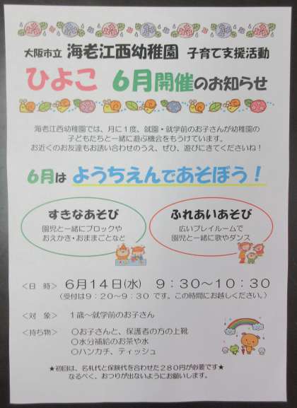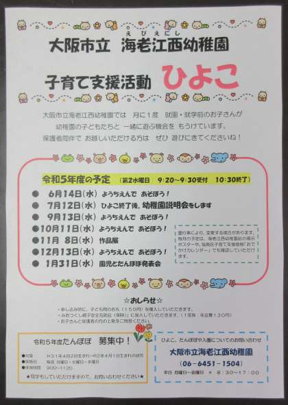 子育て支援活動「ひよこ」 公開日 2023/05/23 更新日 2023/05/23 お知らせ 海老江西幼稚園では、月に1度、就園・就学前のお子さんが幼稚園の子どもたちと遊ぶ機会をもうけています。保護者の方と一緒にお越しいただける方は、ぜひご参加ください! ※ お申込み時に、子ども用の名札(150円)を購入していただきます。また、みおつくし親子安全互助会(保険)に加入していただきます。(1家族:年会費130円) いいね(0)