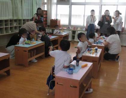 おうちの人に見てもらい、にこにこしながら食べていました。