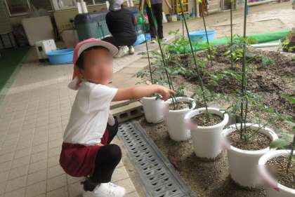 野菜の赤ちゃんがいるよ! 公開日 2023/06/05 更新日 2023/06/05 子どもの様子 毎日、野菜にお水をあげている子どもたち。 花が咲き、小さな実ができてきました。 「ぼくの、小さいナスがついてる!」 「緑のトマト、ついてる!」 「早く食べたい!」 「まっかっか〜まっかっか〜まっかっかにな〜れ!」 生長が楽しみですね。 いいね(0)