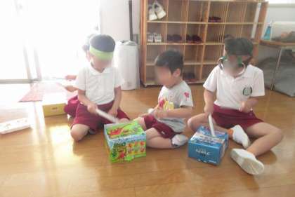 まつ組のお店屋さんごっこの時には、ライブごっこもあり、音楽に合わせて、ダンスをしたり、手づくりの太鼓を鳴らしたりしています。
