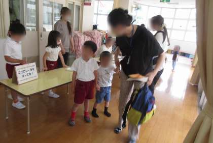 まつ組が、受付で、ひよこの友達を出迎え、保育室まで案内してくれました。