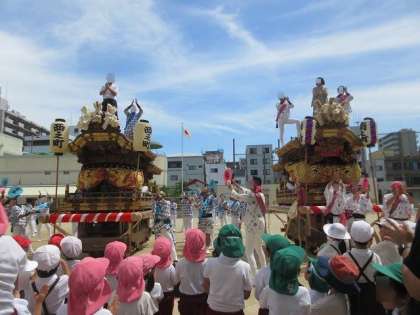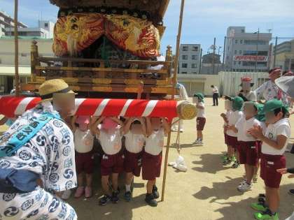 小学生と一緒に、お囃子を聞いたり、山車を近くで見せてもらったりしました。
