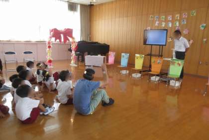 園長先生のお話のプレゼントを聞いたり、みんなで一緒にダンスをしたりして、楽しいひと時を過ごしました。