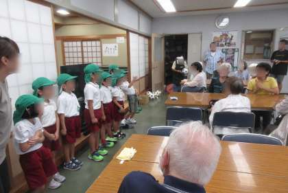 少し緊張していた様子もありましたが、『♪とんぼのめがね』を歌ったり、『♪かたたたき』のふれあい遊びをしたりし、おじいさんおばあさんとの関わりを楽しんでいました。