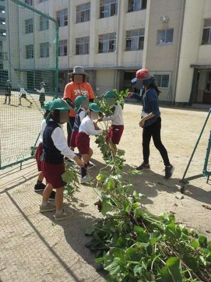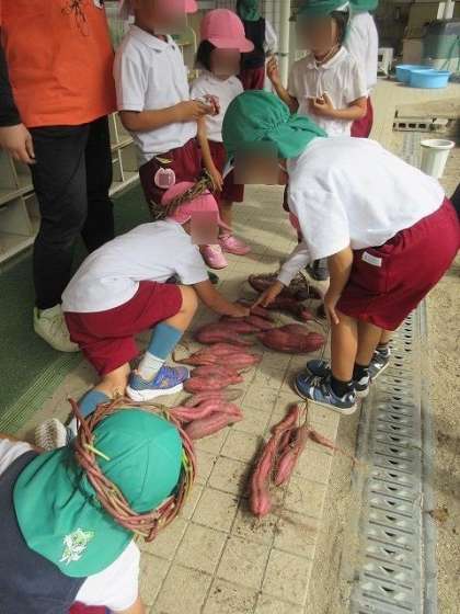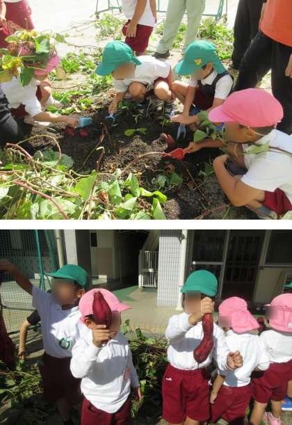 幼稚園の芋畑のおいもを、みんなで掘りました。