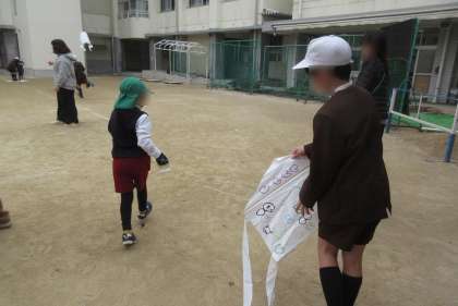 6年生は、幼稚園の子どもたちが凧あげをしやすいように凧を支えてくれたり、糸が絡まりそうになったときは助けてくれたり、とても優しく関わってくれ、子どもたちも親しみをもち、楽しんでいました。