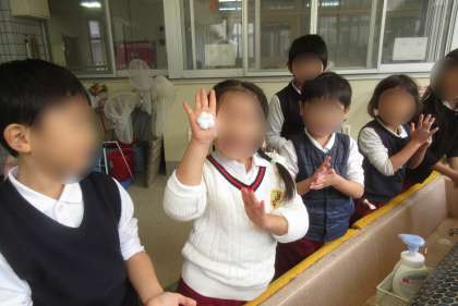 水がとても冷たく手洗い・うがいをするのが億劫になる時季ですが、子どもたちが手洗いを楽しく自らすすんでできるように石けんで洗い流すことができるバイキンのスタンプと花の形で泡がでてくる石けんを準備しました。