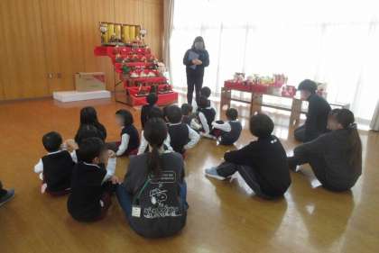 ひなまつりの由来や雛飾りについて詳しく教えてもらったり、園長先生に『ひなまつりセブン』の読み聞かせをしてもらったり、「♪うれしいひなまつり」を歌ったりしました。