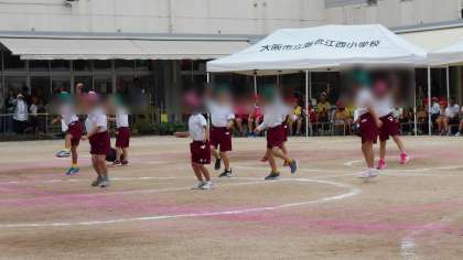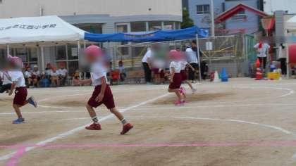 かけっこでは、力いっぱい小学生のお兄さんお姉さんの所まで頑張って走っていました。