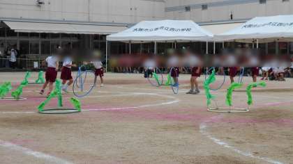 フープを転がしてキャッチしたり、フープを回してまわりを走ったり、最後には、わかめの様に体を揺らしフープを腰で回しました。