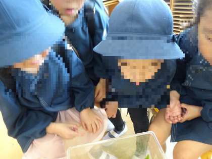 「小さくてかわいいね」「何を食べて大きくなるのかな?」と興味津々の子どもたち。これからそら組で「育てよう」と話し合いもしました。