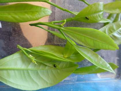 ミカンの木にアゲハチョウの卵や幼虫がいました。