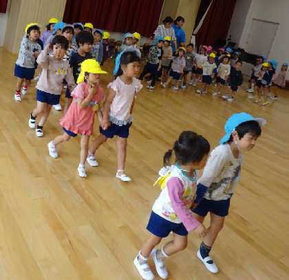 一緒に手をつないで音楽に合わせて歩いたり、「むしむしジャンケン」の遊びをしたりして楽しみました。