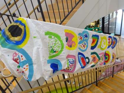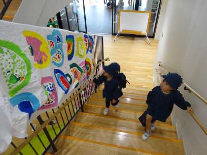 今日も雨だったので、空に大きいこいのぼりをあげることができず、階段に飾っていました。登園してきた子どもたちが「そら組のこいのぼりや!!」と嬉しそうに見ながら階段を上がっていました。