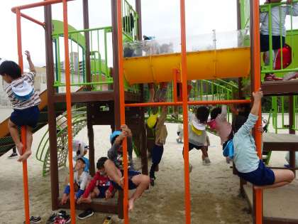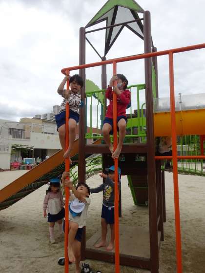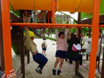 今チャレンジしているおともだちも「すごいね!」と登りたい意欲が増しているようでした。横のうんていではほし組、ゆき組のおともだちも「みてみて!」とチャレンジしています。始めはぶら下がるのも難しい中、「3秒ぶらさがれた」「いっこ前にいけた」と遊ぶ中で自分で自然に目標をもち、チャレンジしながら楽しんでいます。