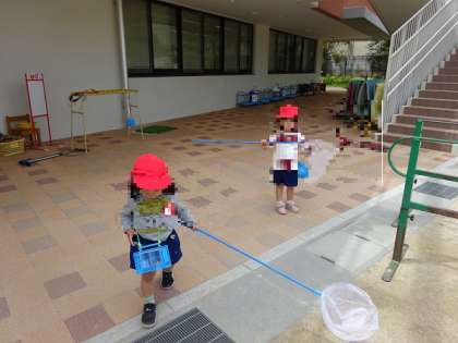 なぜだか、虫網と虫かごをもってダンゴムシ探しに行くいちご組さん。