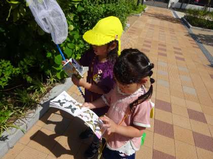 最近、図鑑を持って園庭に出て虫探しをする子が増えてきました。