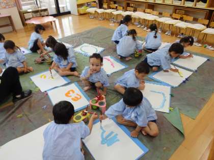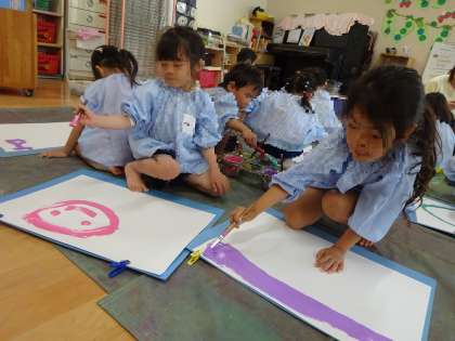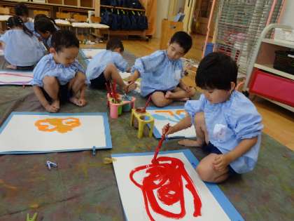 絵の具を使って遊ぶ機会をたくさんつくって、想像力を膨らませたり、表現することの楽しさを感じたり、色のきれいさや絵の具の感触を味わったりしながら、豊かな感性が育っていくようにしていきたいと思います。