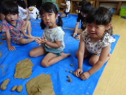 今日は土粘土で遊びました。普段の土と感触が違ったようで「ねちょねちょしてる!」「ふんだらつるっとした!」「冷たい!」と感触を楽しんでいました。