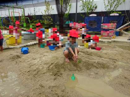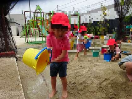 砂場には、午前中に年中長組さんが遊んだ後があって、