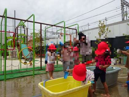 水をためるタライのシャワーが暴れて、いちご組の友達に水がかかりました。