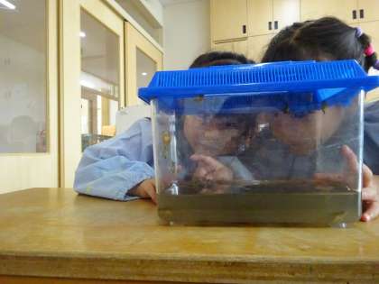 足が生えてきてるオタマジャクシや緑色に変わってるおたまじゃくしを見て、「すごい!」「これがあかちゃん?」と驚いていました。