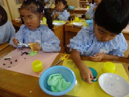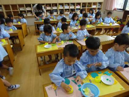 そのあと、カエルをつくってみようと画用紙で顔や体を作り始めました。「笑ったかえるさん」「鼻もつけたよ」と思い思いのカエルを作りました。