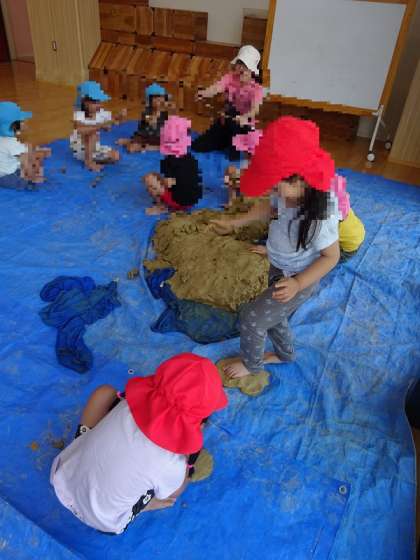 土粘土を足で踏んでぺったんこにして、ピザをつくっていました。